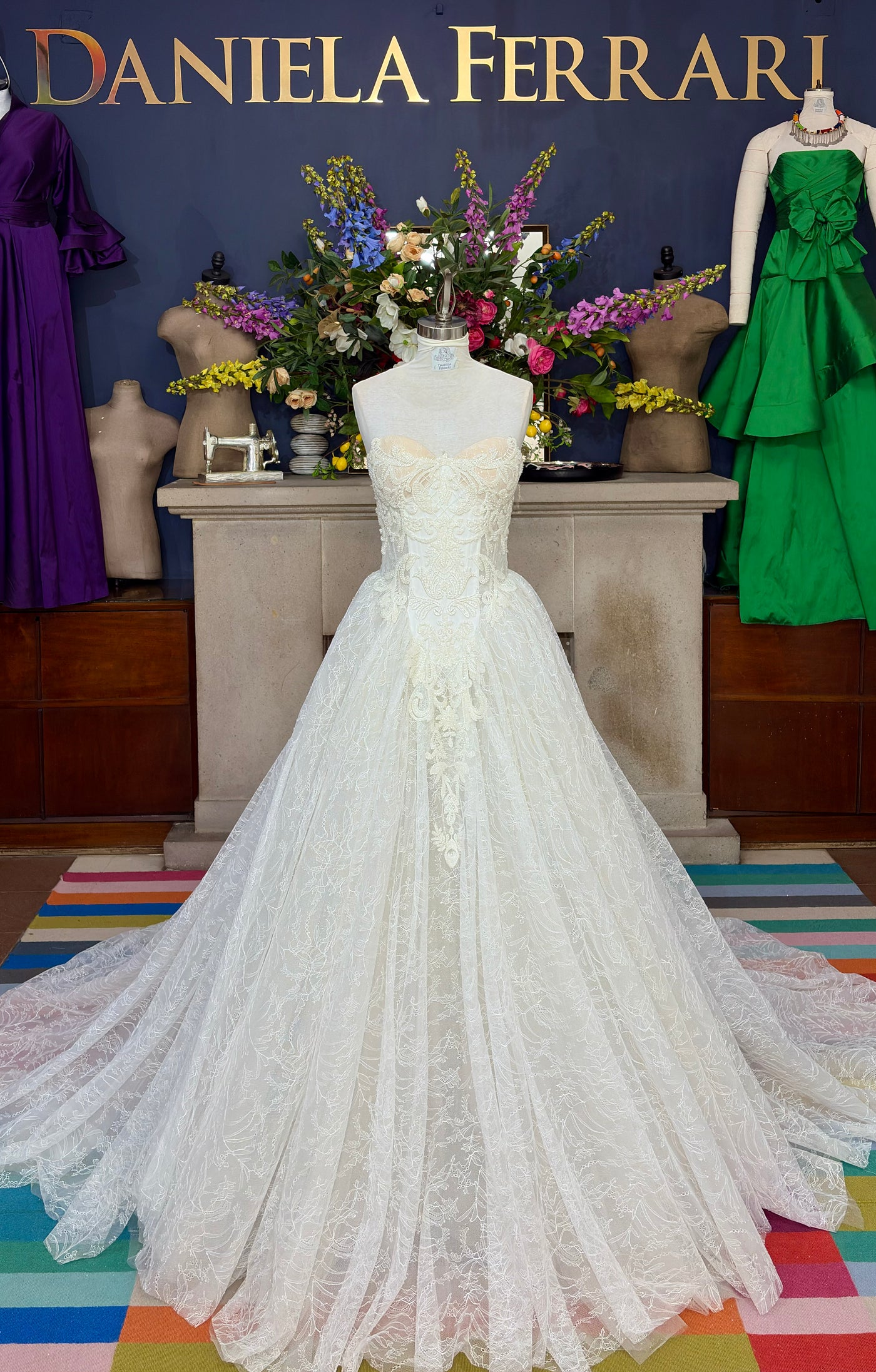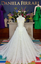 Un homenaje a la alta costura nupcial. Este vestido de novia presenta un corset tipo corazón con estructura visible y transparencias suaves que definen el torso con precisión. El encaje de motivos clásicos recorre todo el diseño, desde el busto hasta la amplia falda con cauda, creando un efecto envolvente y sofisticado. La silueta, marcada por su corte en A con volumen elegante, evoca la grandeza de las novias más emblemáticas de la historia.
