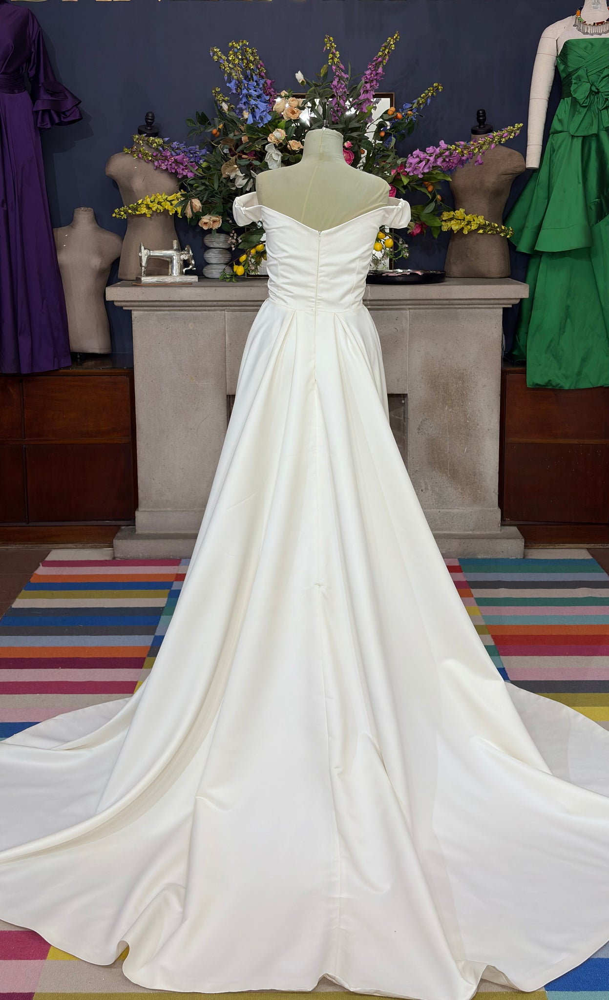 Descubre la elegancia atemporal de este vestido de novia con escote off-shoulder, confeccionado en satén de alta costura con caída suave y movimiento delicado. Su diseño destaca por el cuerpo drapeado en forma cruzada que realza la silueta femenina con sofisticación, y una falda amplia con cauda que aporta un aire clásico y majestuoso. Ideal para novias que buscan un vestido minimalista pero impactante, este modelo celebra la feminidad con un estilo limpio y refinado.✨