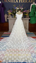 Romanticismo en su máxima expresión. Este vestido de novia presenta un escote caído con drapeado suave que envuelve el busto con naturalidad y elegancia. La falda amplia de tul bordado con motivos florales distribuidos armoniosamente aporta una textura ligera, con una cauda que flota como un suspiro al caminar.
