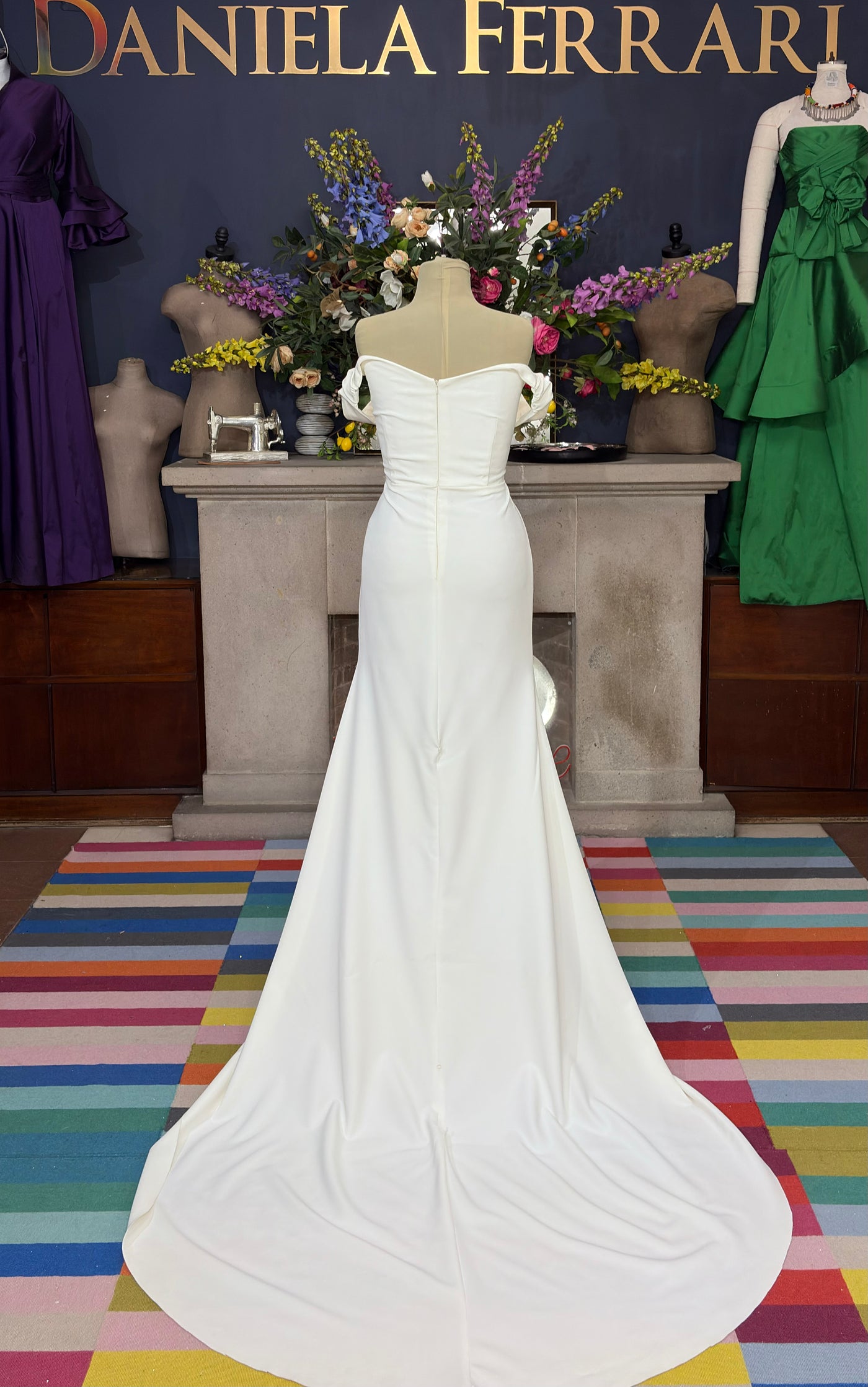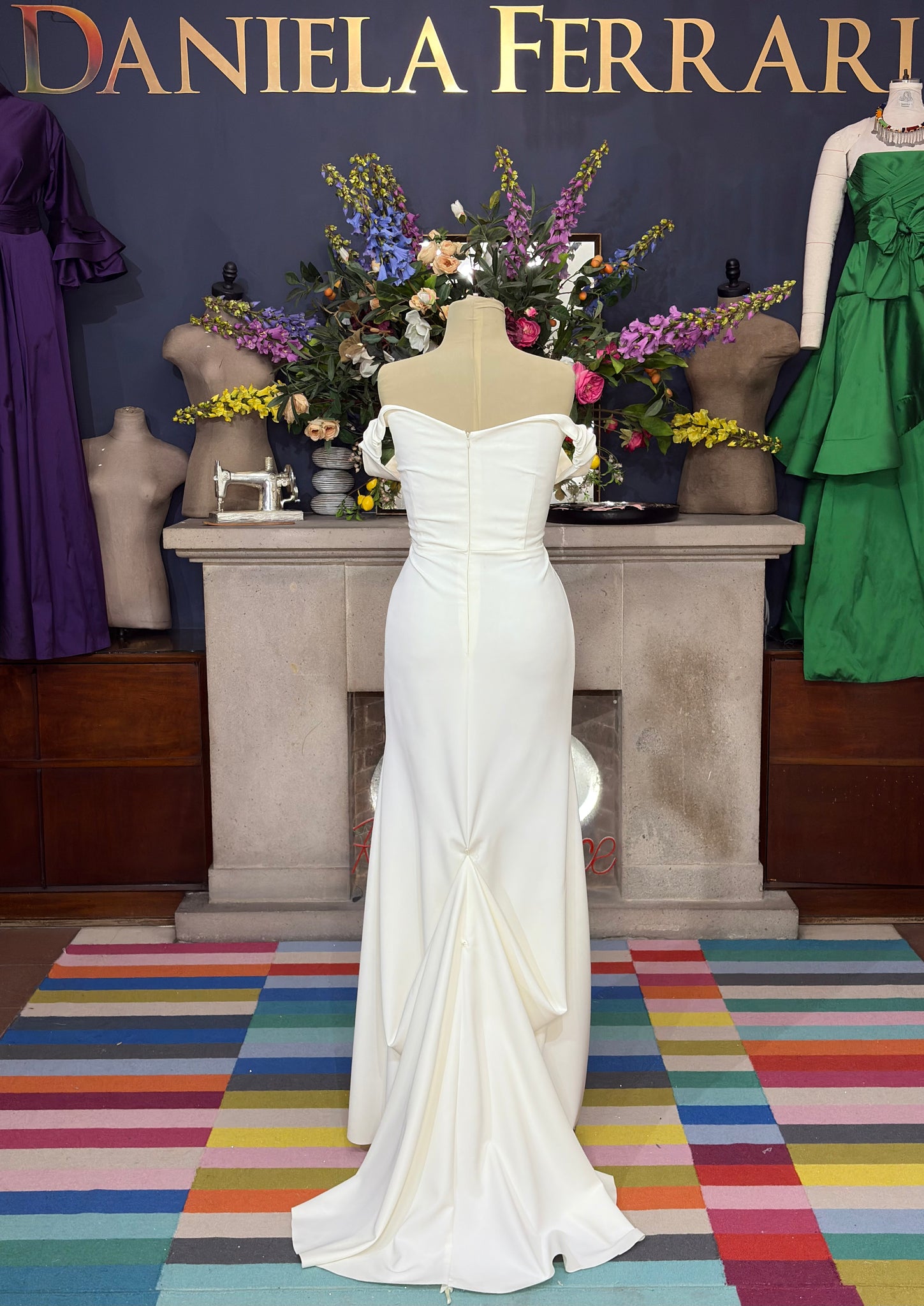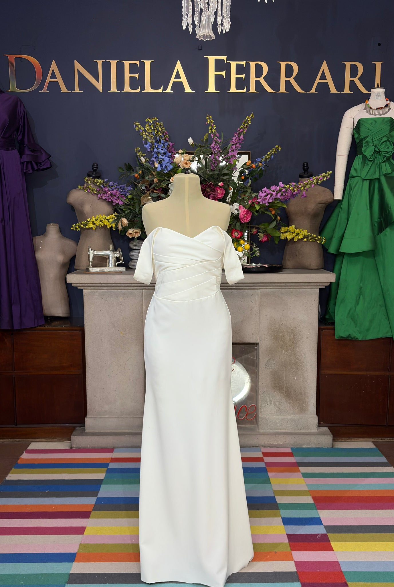 Romántico y sofisticado, este vestido de novia diseñado por Daniela Ferrari Brides es una oda a la elegancia atemporal. Confeccionado en satén mate de alta calidad, su escote corazón realza el busto con sutileza, mientras que las mangas caídas brindan un toque etéreo y femenino. El cuerpo entallado cuenta con un delicado drapeado en diagonal que estiliza la silueta, enmarcando la figura con gracia. La falda de corte sirena fluye con una cauda sutil que aporta movimiento y presencia sin restar ligereza. Ideal para novias que buscan un vestido moderno, elegante y de líneas puras.✨