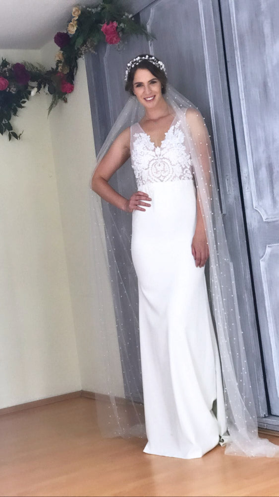 Este vestido es súper sexy pero cuidamos cada detalle para que sea muy elegante. Talle de tulle italiano con bordado centrado y transparencia. Botones forrados en la espalda. Falda sirena de crepé de seda con cola mediana. El tacto es suavecito comodisimo! Le puedes poner cauda desmontable para la ceremonia y se vería espectacular!